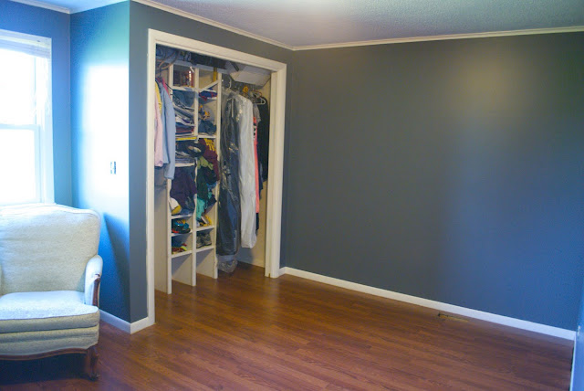 Not before, but during. I forgot to take a before picture..... (Bad Sarah!) But you can see the color of the walls - blue - and a bit of the carpet.